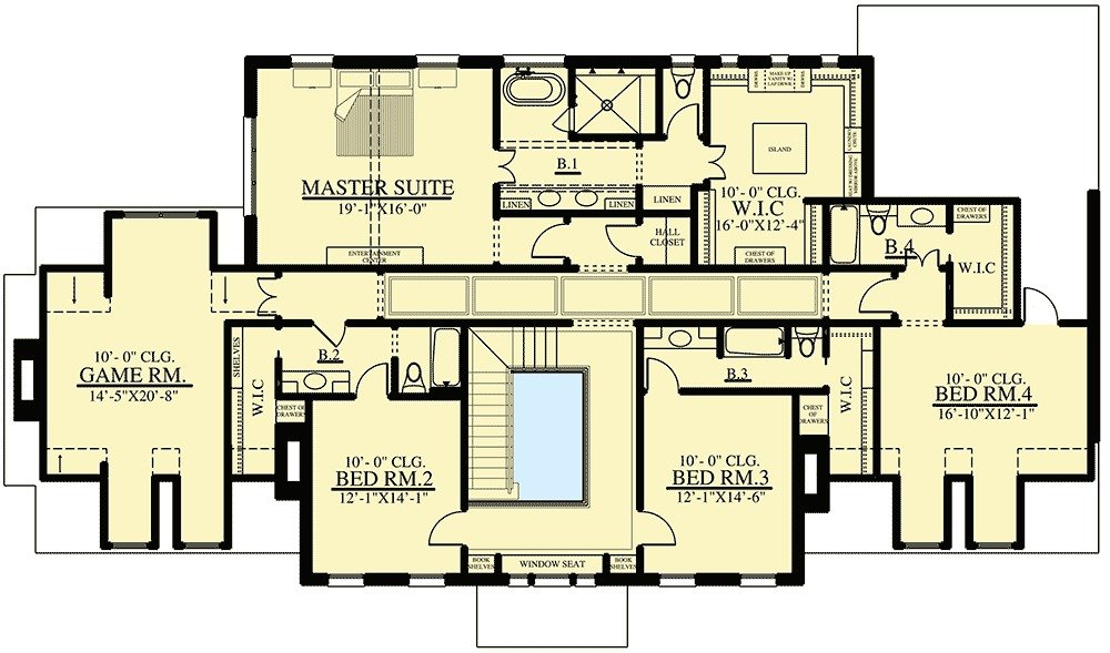 A coffered ceiling above the kitchen helps define the space and is centered above a large island. Discover a prep pantry behind the kitchen, which nearly doubles work and storage space.