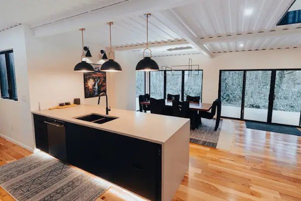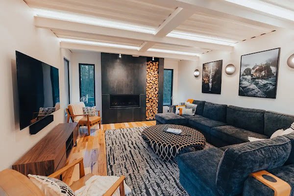 The Bin offers 1600 square feet of interior space and 900 square feet of exterior deck space, sleeps 7 adults, one king bed, one full bed and 3 twin beds. The Bin boasts a large full service kitchen, hot tub, steam shower, private hiking trails, multilevel large wrap-around deck, indoor fireplace, outdoor firepit, helicopter landing zone, car charger, TV, high speed internet, and so much more!